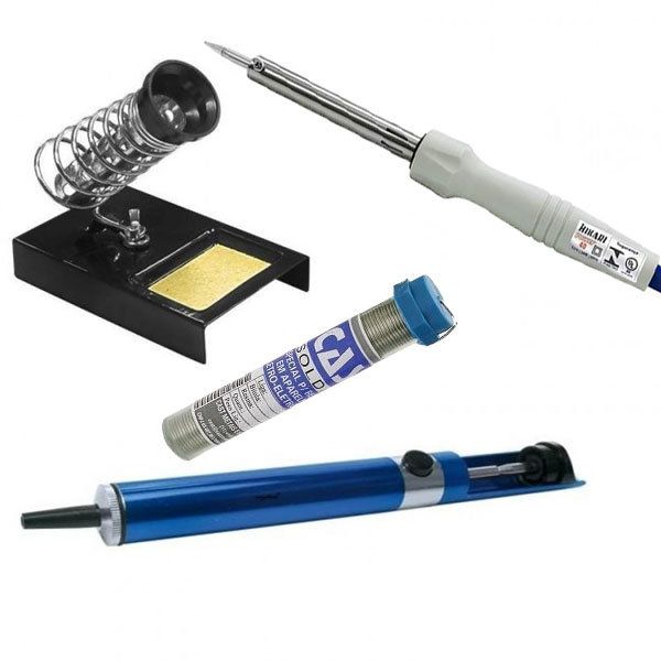 Este Kit de Solda constituído de um ferro de solda de 40W de 220V, um suporte, um sugador de solda e um tubo de estanho é ideal para substituição de componentes em placas de circuito impresso e pequenos protótipos.