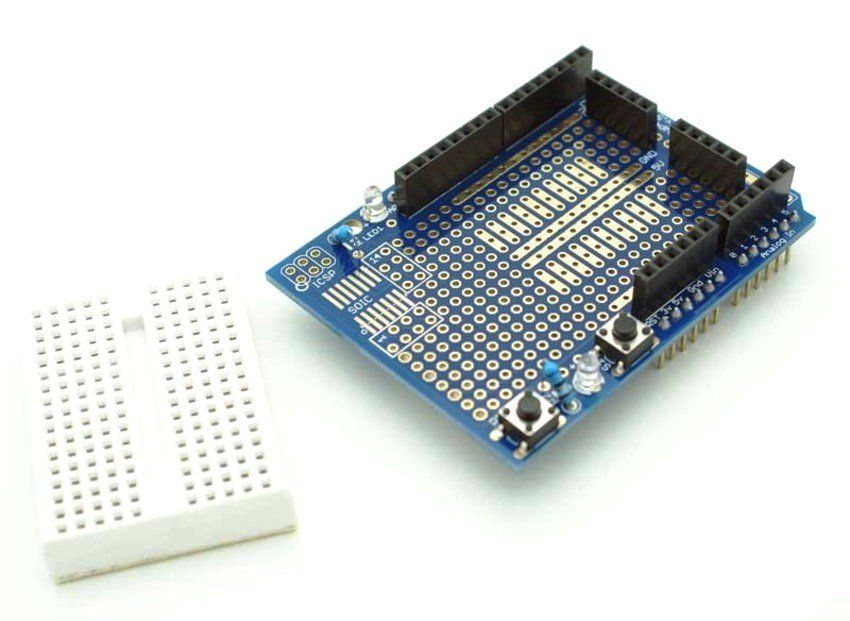 O Proto Shield com Mini Protoboard para Arduino Uno é ideal para processos de prototipagem com placas Arduino pois foi projetado de forma a encaixar-se perfeitamente sobre a placa Arduino Uno, fornecendo ao usuário uma área livre de trabalho com 2 led's de uso geral, 2 botões e todos os pinos do Arduino de forma a facilitar a interação dos mesmos com seu protótipo.